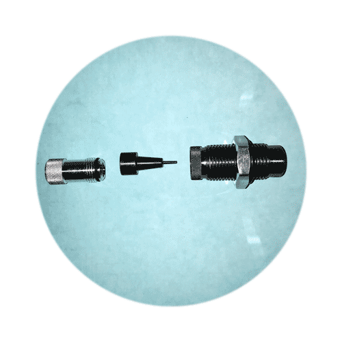 - первым делом рекомендуется делать декапсуляцию и развальцовку: конус с устанавливается в матрице и пропускаем стреляные гильзы через эту операцию, таким образом получаем развальцованые в трубочку и декапсулированые гильзы.